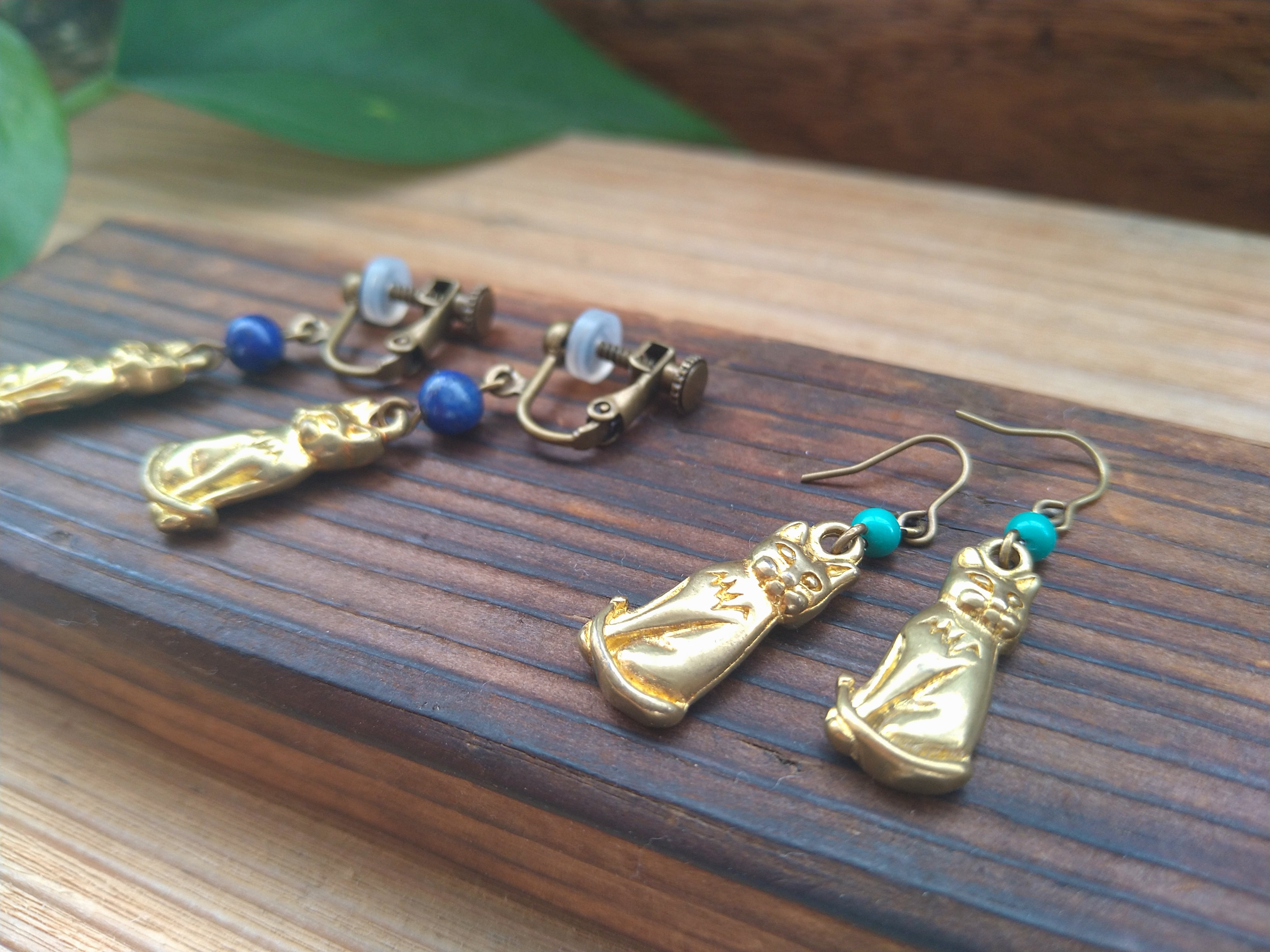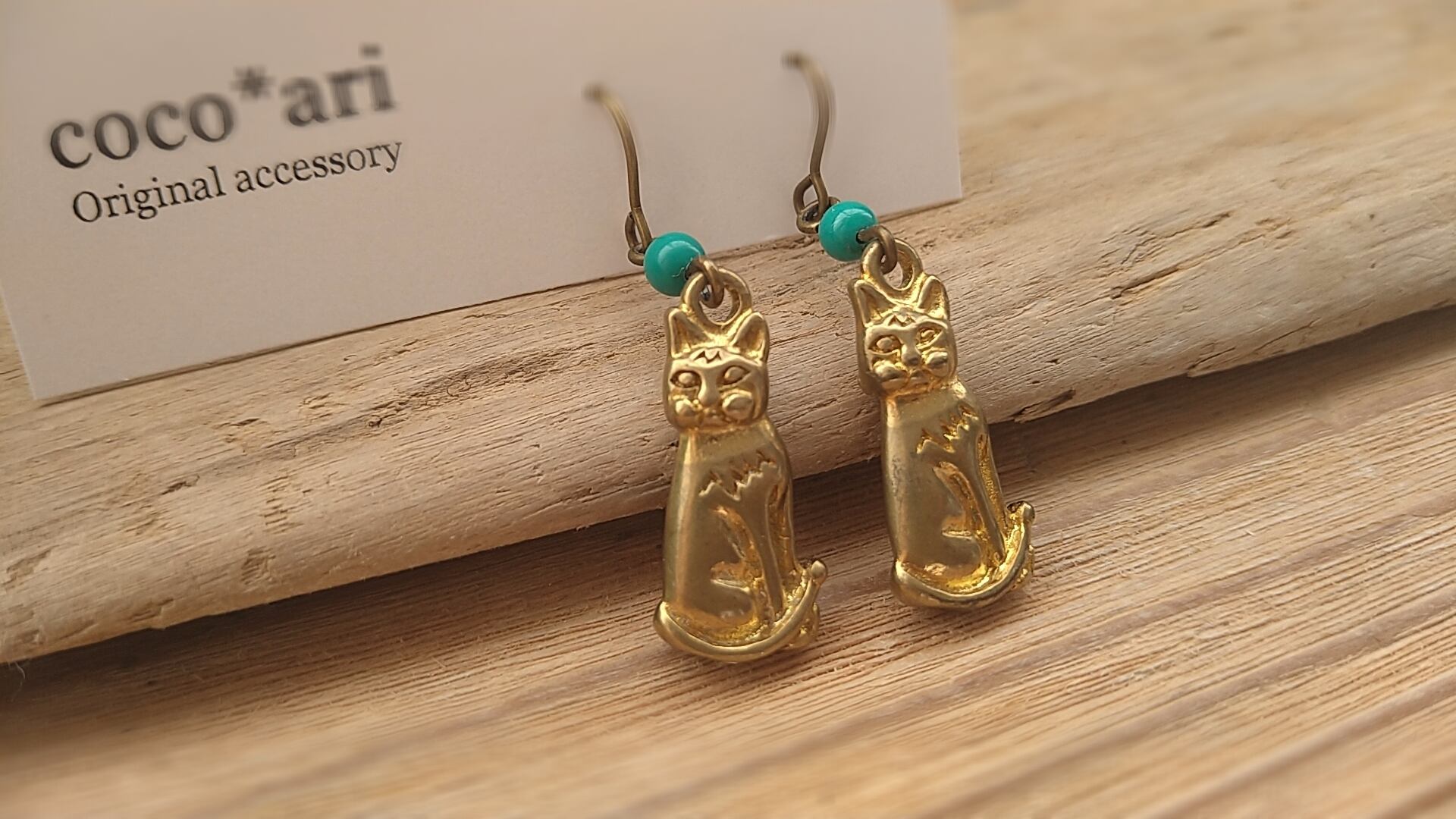 真鍮製の猫に小粒のターコイズを組み合わせた 神秘的なアクセサリーです。